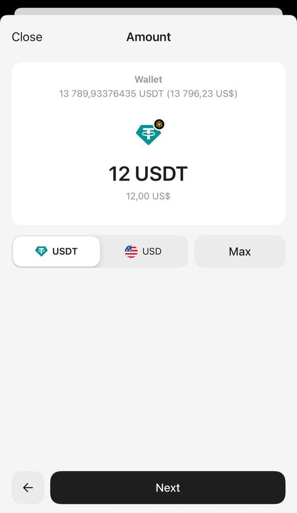 4. Nhập số lượng token muốn gửi. Bạn có thể nhập số lượng token hoặc giá trị quy đổi sang USD. Nếu muốn gửi toàn bộ số dư, chọn Max. Sau khi hoàn tất, nhấn Next.