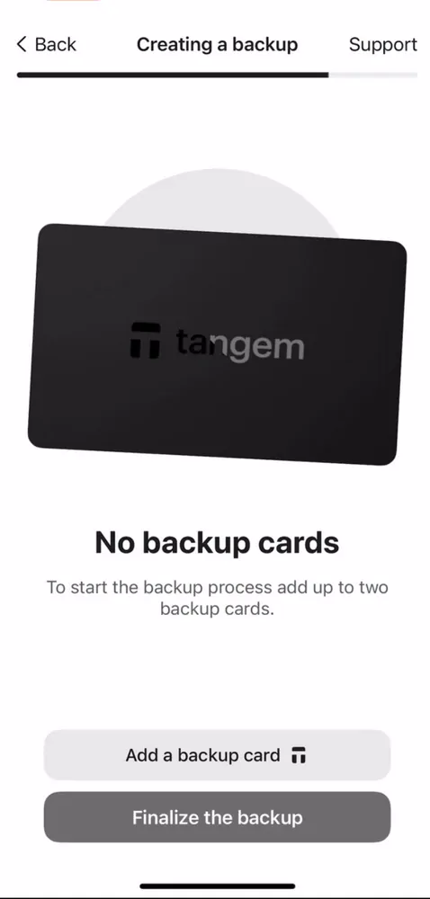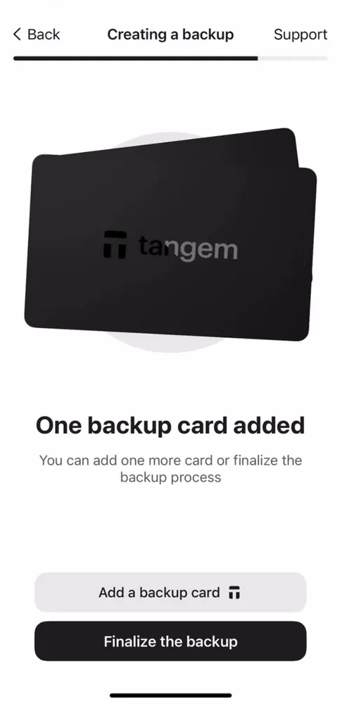 3. Nếu có thẻ Tangem thứ ba, tiếp tục chọn Add a backup card, quét thẻ thứ ba, rồi nhấn Finalize the backup (Hoàn tất sao lưu).