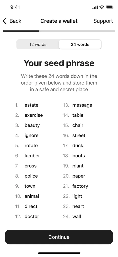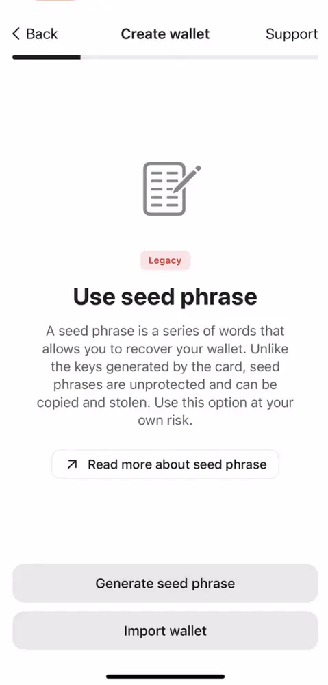 Ứng dụng Tangem sẽ tạo seed phrase cho bạn. Bạn có thể chọn 12 hoặc 24 từ.