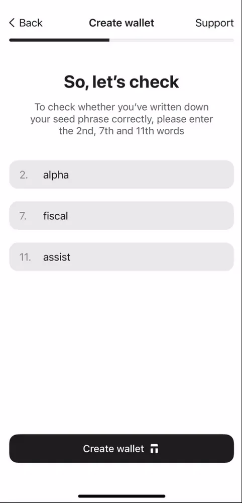 7. Xác nhận rằng bạn đã ghi đúng seed phrase bằng cách nhập lại các từ theo đúng thứ tự.