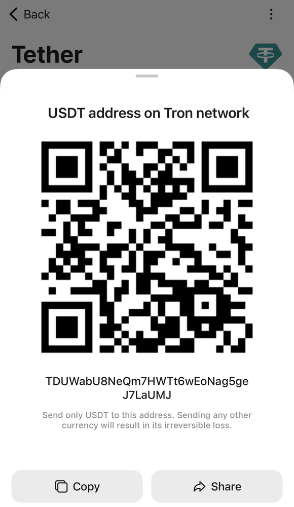 - Chọn Copy hoặc Share để sao chép hoặc chia sẻ địa chỉ ví cho người gửi.